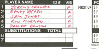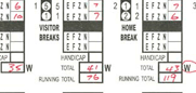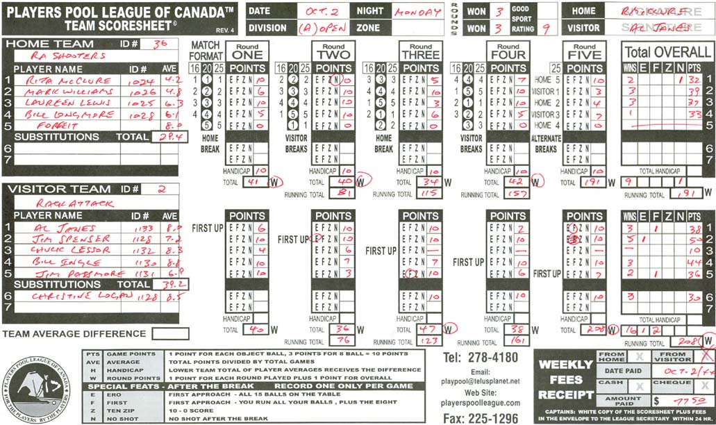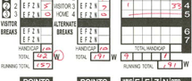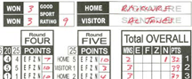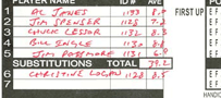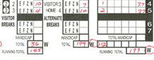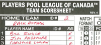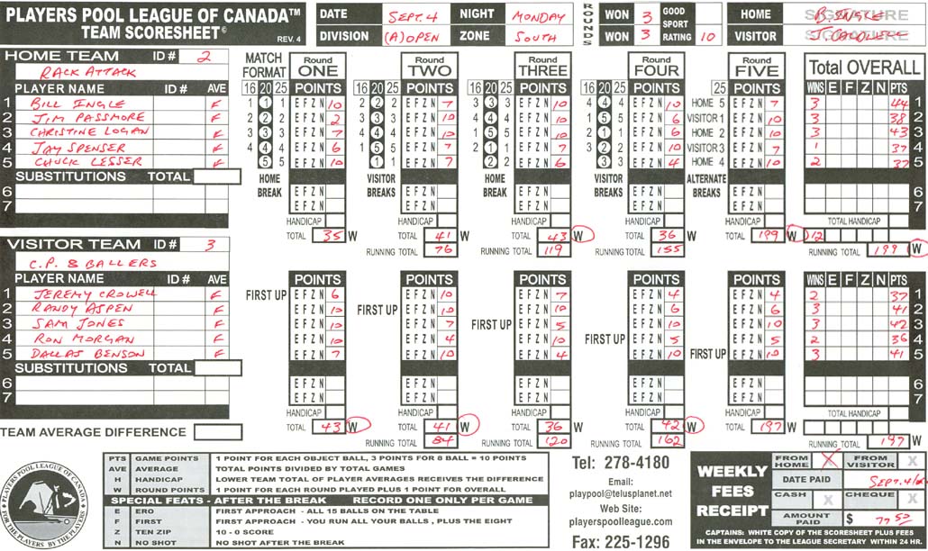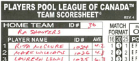 Your Starting Roster * The Score Sheet (example #1) accommodates all of the above Match Formats. * The Home Team fills out their Roster first by entering (4) or (5) Player names depending on the Match Format your League or Division is using. * Spares may be listed at any time prior to the Round they are being 'substituted' into the Match. * Players may be listed in any order regardless of their Player Averages. * Should a Team be short multiple Player(s), "Forfeit" is entered on the starting Roster. See "Match Polices" for Re-Scheduling