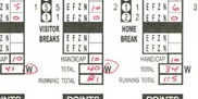 Summary All Games are scored on a Point System and each Player develops a Points Average throughout the League Schedule. These Player Points Averages are used to determine a 'Team Handicap in Points'. In rotating Match Formats, there are multiple 'Rounds' played. The Points that a Team scores in each 'Round' plus any Team Handicap Points they get, will determine which Team wins the 'Round Point'. The number of 'Round Points' won in each Match will determine the success of the Team.